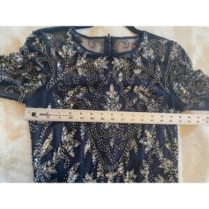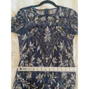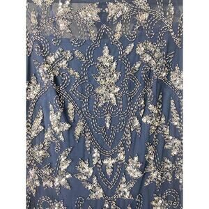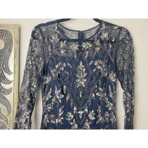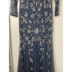 Adrianna Papell Long Gown Beaded Sequined Maxi Bridesmaid Dress with Godets in Deep Blue Metallic sz 4