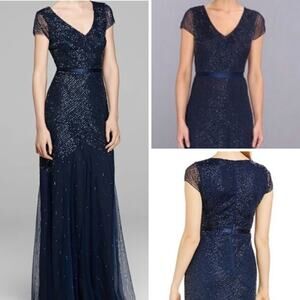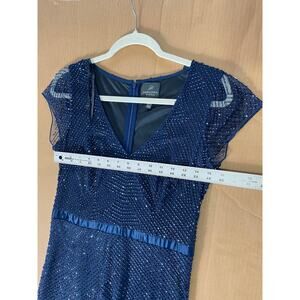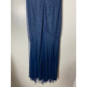 ADRIANNA PAPELL DRESS 6 BEADED MAXI LONG GOWN LATTICE PATTERN SATIN WAIST BAND NAVY BLUE MESH SHEER WHIMSIGOTH WHIMSICAL FAIRY EVENING FORMAL ELEGANT FESTIVE CHRISTMAS HOLIDAY WORK PARTY