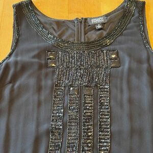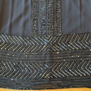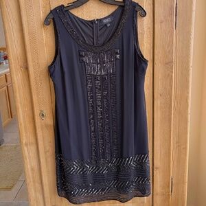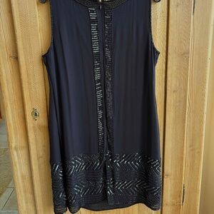 ADRIANNA PAPELL EVENING Black Silk Chiffon Beaded Cocktail Dress, Size 14. Fully lined with art-deco style beaded and sequined trim. Falls away from the body in a comfortable a-line shape.Measures 20" pit to pit and 36" shoulder to hem. Excellent used condition.