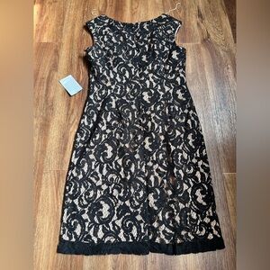This stunning sheath dress by Adrianna Papell features a sleeveless design with a scoop neckline, perfect for cocktail events or as a wedding guest. The black lace overlay on a cream base creates a sophisticated contrast, while the fitted silhouette offers a flattering midi length.
