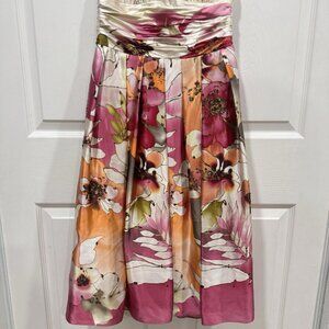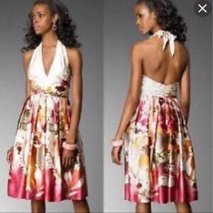 This Adrianna Papell halter dress is a stunning floral sequin silk gown in a size 4, perfect for a bridal or spring occasion. The dress features a backless design, ruched detailing, and a high waist, giving it a flattering fit. With its midi length and sleeveless halter neckline, this vibrant multicolor dress is ideal for summer, fall, or spring events. The intricate floral pattern and sequin accents add a touch of elegance, making it a standout piece for any party or cocktail event.