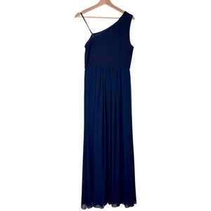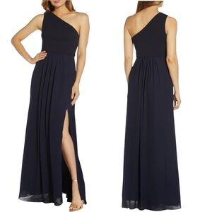 ADRIANNA PAPELL MIDNIGHT BLUE ONE SHOULDER CREPE CHIFFON HIGH SLIT GOWN DRESS