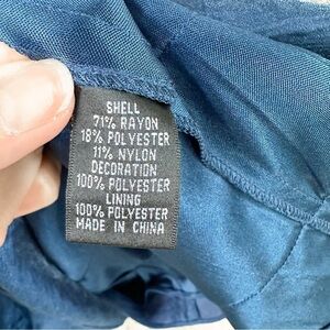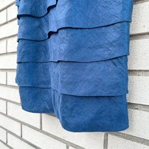 ADRIANNA PAPELL Occasions Blue Embroidered Tiered Dress. Shimmery blue fabric. V-neckline with squared opening at the shoulders. Navy blue and silver embroidery with tiny beads. Tiered skirt. Rear zipper closure. Fully lined. Made of 71% rayon, 18% polyester, and 11% nylon. Decoration and lining are made of 100% polyester. Size 8. Excellent used condition.
