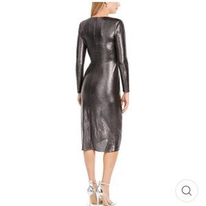 This metallic midi dress by Adrianna Papell is a statement piece ideal for special events. The wrap style v-neck and hem create a ruched fitted silhouette whilst the shoulder pads and long sleeves give a sophisticated finish. Wear with stiletto heels and a matching clutch for an elevated look.
