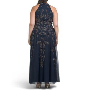 ADRIANNA PAPELL Rose Gold/Navy Sleeveless Halter Beaded Gown