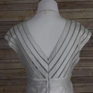 ADRIANNA PAPELL Silver/Gray Layered & Textured Sleeveless Lined Empire Waist Formal Dress, Size 4. This elegant and sophisticated sleeveless dress has a beautiful silver/gray color hue with a layered design element on the body and a solid and tulle fabric striped bodice, cross-over front bodice, empire waist, lined body, v-neckline, and a hidden back zip closure. The material is as follows: 100% Polyester. The approximate measurements are as follows: Length = 37", Bust = 34", and Waist= 34".