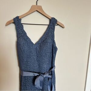 Delicate eyelash fringe flutters along the edges of an Adrianna Papell gown lavishly covered in lace and tied with a pretty ribbon at the slimmest part of the waistline.