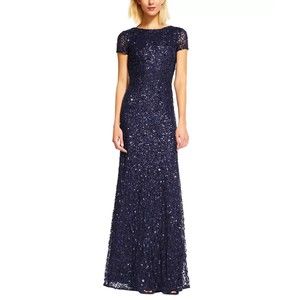 ADRIANNA PAPPEL Navy Blue Sequin Embellished Beaded Gown w/ Train Size: 0P (Petite) Color: Navy Bust 32" Waist 26" Hip 36" Length 59" front length. Catch the light in every room in this petite gown from Adrianna Papell designed with a gorgeous scoop back and an array of shimmering sequins. Round neckline Back zipper closure Short semi-sheer sleeves Floor-length formal dress Allover sequins; scoop back Shell, lining: polyester NEW without tag - store display