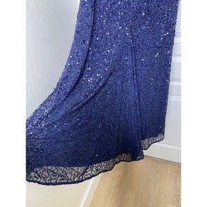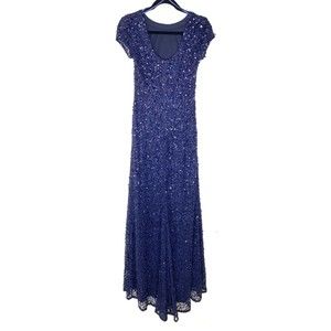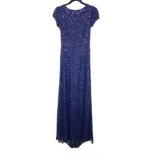 💙 ADRIANNA PAPPEL Navy Blue Sequin Embellished Beaded Gown w/ Train 0P Petite