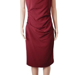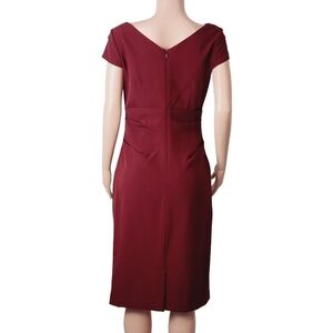 This exquisite Adrianna Papell dress is sure to turn heads! The vibrant brick red hue of the dress is brought to life with its unique asymmetrical scrunched design and midi length. The neckline is beautifully framed and the back has a flattering v that drops into s zipper. The dress is finished off with Cap sleeves. The dress is crafted from a comfortable yet sophisticated fabric that hugs your curves in the best way. With this dress, you'll be sure to command the room and make a lasting impression. This is a timeless piece that is perfect for both day and night occasions.