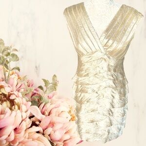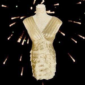 10Petite Gold bandage dress. Layers of gorgeous gold fabric that fits to your figure like a glove. Absolutely stunning on! Perfect on Perfect condition. Worn for a photo shoot for 2 hours.