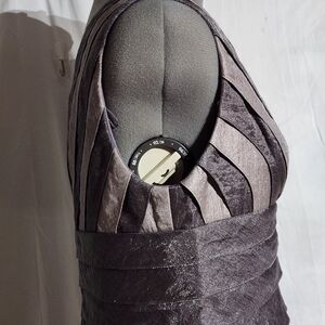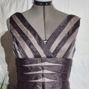 A gorgeous dress with two tone pleating on the bodice with a very flattering v-neck cut. The skirt is made up entirely of shutter pleats for a striking look. Back zipper, fully lined. In excellent condition.