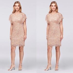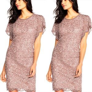 Glamorous allover beading and sequins take center stage on this knee-length cocktail dress. Rows of peals trace the scalloped flutter sleeves and hemline. By Adrianna Papell Polyester Back zipper
