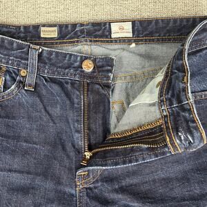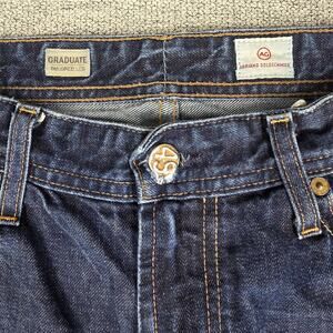 AG Adriano Goldschmied “The Graduate” tailored leg jeans in men’s size 32R, style #1174CRV-1-017. 100% cotton denim in a classic dark blue wash, these jeans offer a relaxed fit from hip to knee with a slight taper at the leg opening. Designed for timeless comfort and versatile styling, they feature a zip fly, button closure, and five-pocket construction.
