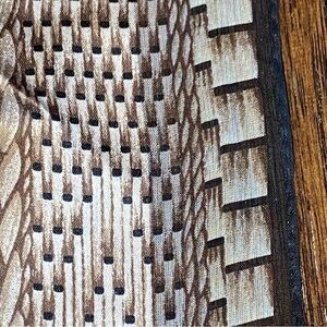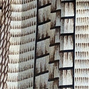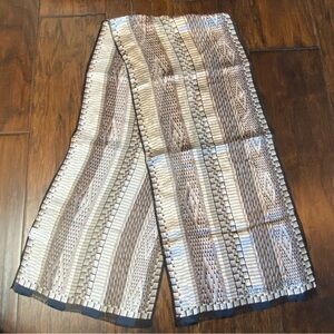 Beautifully neutral geometric patterned silk scarf. Hand rolled edges. Fringe ends.