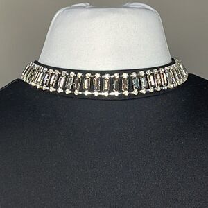 High jewel neckline embellished all around w/ smoke colored baguette style & round clear rhinestones set in silver