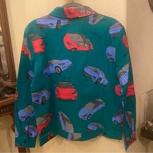 Pre-owned in great condition with no rips or stains. Fun multicolor all over graphic Tesla cars zipped jacket. Can be unisex. Comes from smoke and pet free home.