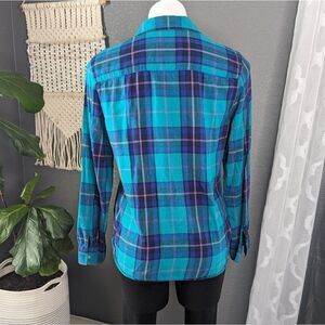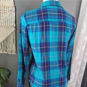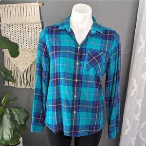 American Eagle Outfitters teal and pink plaid button down shirt.