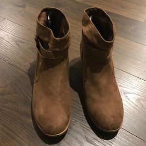 AE (American Eagle) booties. Slip on style. Caramel color. Gold rust buckle. Size 6 1/2. Worn twice. Practically LIKE NEW!