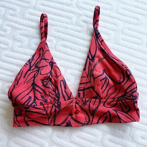 This AE Aerie bikini set is a must-have for your next beach or pool day! The deep orange base with navy blue abstract floral pattern gives it a trendy, eye-catching look. The triangle-style bikini top includes an inner slip for removable bra pads (pads not included, but any small triangular bra pads will fit). The matching bikini bottoms provide a flattering fit, making this a stylish and comfortable two-piece swimsuit for summer.