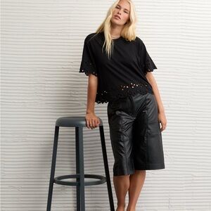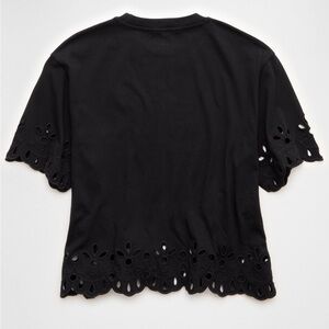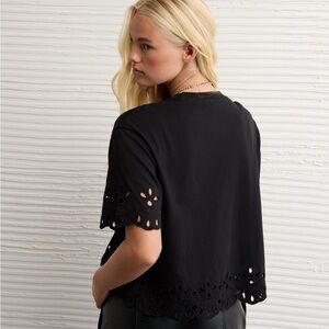 Elevate your style with this chic black top featuring a delicate eyelet hem. Perfect for any occasion, this top combines elegance with comfort.