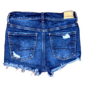 This is a GREAT pair of AE American Eagle Next Level Stretch Hi-Rise Shortie High Rise Distressed Fray Cut Off Hem Denim Jeans Shorts that have two back pockets with stitching on each!!!! Details as follows: