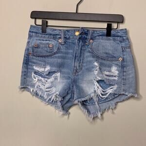 Description: These American Eagle jeans are a closet staple for the summer. Ultra cute factory distressing with blue lace detail pockets peeking out. Pair with a crop top and some cool shoes for a killer festival look.