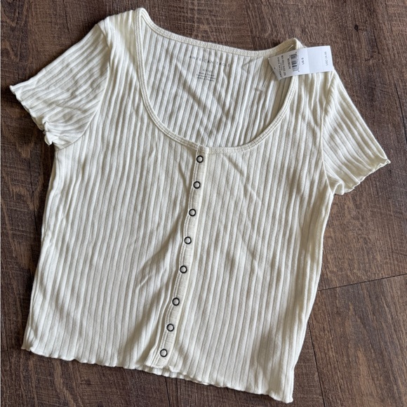 Elevate your wardrobe with this chic cream ribbed button-down top. Perfect for any occasion, this top offers both style and comfort.
