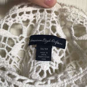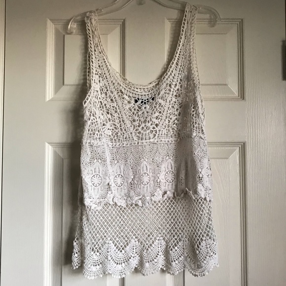 Slightly off-white tank with 3 tiers of different crochet styles. See photo for one gap. Smoke free home, not a pet free home.