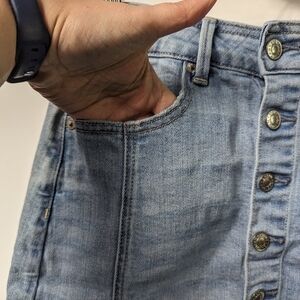 This skirt is in gently used condition. The material is a medium weight stretchy denim. Features functional front buttons. Please see photos for details.