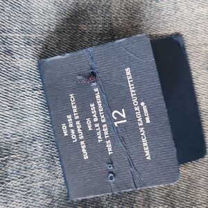 American Eagle medium wash light distressed denim shorts, midi length, low-rise, size 12, super super stretch.