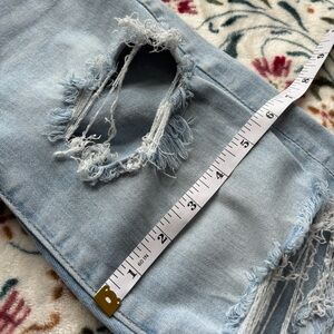Trendy light blue cropped jeans with distressed details. Ideal for a casual look.