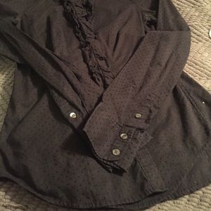 Black, ruffle front, felt dot, button down collar shirt. American Eagle, size 8. Good condition - some of the dots are faded where fabric rubs (underarms) otherwise, a great cute top!