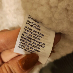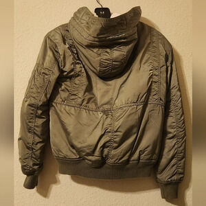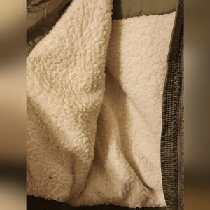 Army green satin hooded jacket, cozy fleece lining. Lots of pockets, in excellent condition.