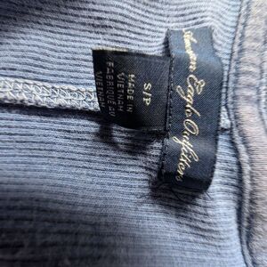 This 2010s American Eagle Outfitters henley top is a moody blue-gray and made from ultra-soft stretchy ribbed cotton with a flattering scoop neckline and full button front. Longline silhouette is perfect for pairing with low rise jeans or layering under cardigans. Channel major Bella Swan energy from Twilight, or go full Elena Gilbert in early Vampire Diaries. Also totally Hermione on a weekend in Hogsmeade. Tag says S/P (small petite) but super stretchy.