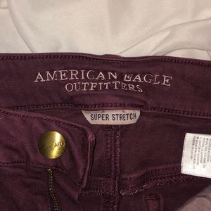 Maroon high rise “shortie” shorts. Very stretchy. In great condition but the hem doesn’t stay rolled up very well, you can see the hem the best in the last photo.