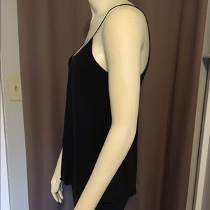Super soft fabric that comes to a soft v in the front and back at the bottom. Super skinny spaghetti straps, not adjustable. Overall loose/ breezy fit. EUC