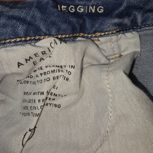 These blue skinny jeans from American Eagle Outfitters showcase a medium to dark wash with prominent distressed patches on the thighs, revealing a lighter shade underneath. The frayed edges add a touch of rugged style, making them perfect for a casual day out.