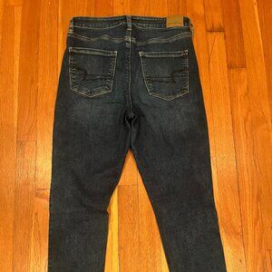 American Eagle dark wash skinny jean with light distressing in the next level stretch material.