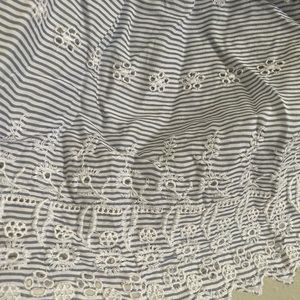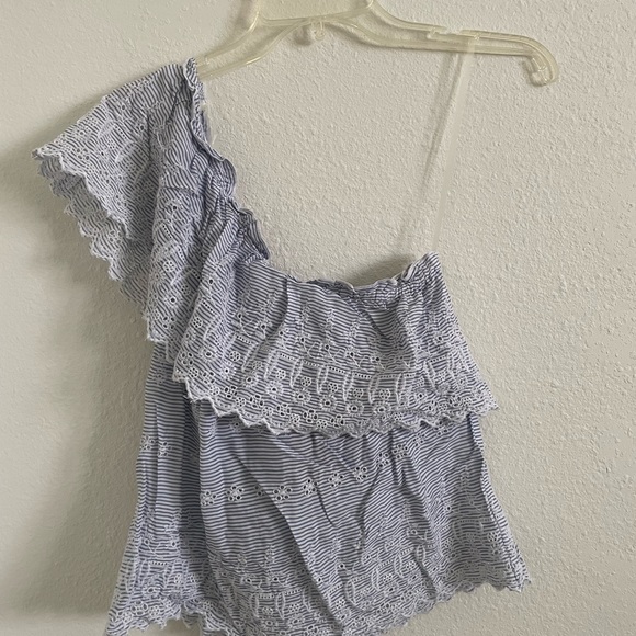 Fits like a medium which is why it’s too big for me. My typical size is XS/S and this is too loose around the bust. One shoulder with eyelet detailing. 100% viscose.