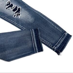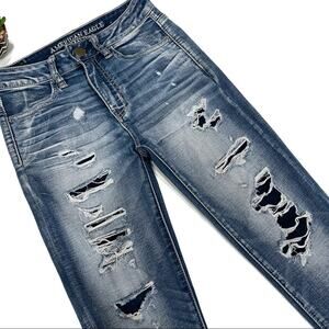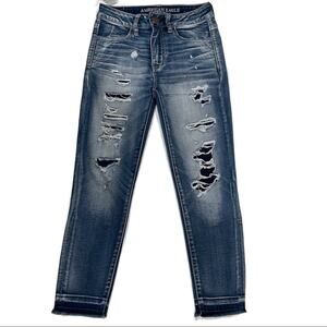 AE Outfitters Super Strech Hi-Rise Jegging Crop Ripped Patched Size 2. Raw hem. High Rise. Medium Wash. Zip fly. Cotton blend. Excellent preowned condition. Measurements taken lying flat.