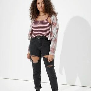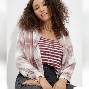 AE Plaid Cropped Button Up Shirt Muted Red Gray