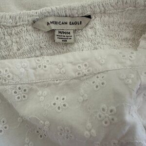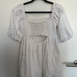 American Eagle Puff Sleeve Mini Dress in white with lacey eyelet fabric in Medium. Cutout detail on back