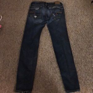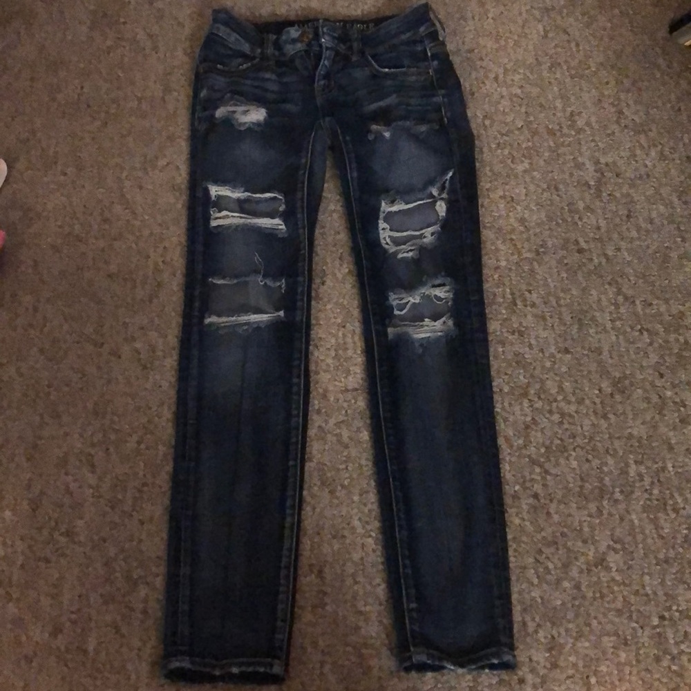 Lightly worn American Eagle Jeans. They are ripped but was bought the exact same way they are in the picture. Dark Wash. 00 Short