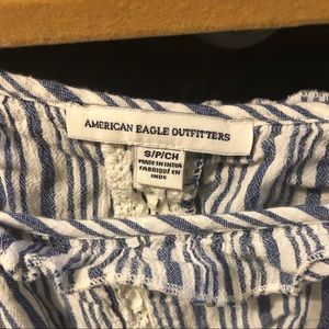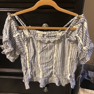 American Eagle ruffle and lace off the shoulder top with a light blue stripe pattern. Has adjustable straps. Size Small. So cute with white jeans/shorts and perfect for spring/summer!