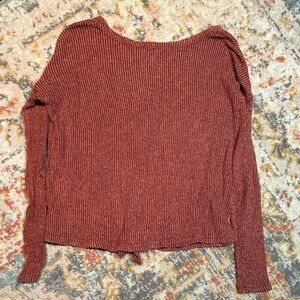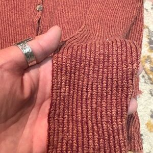 Cozy rust-colored knit top with button-up front and tie detail. The yarn is multicolored with rust orange and hints of red. Drop shoulders and a loose fit.