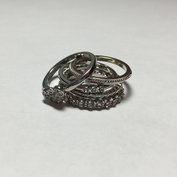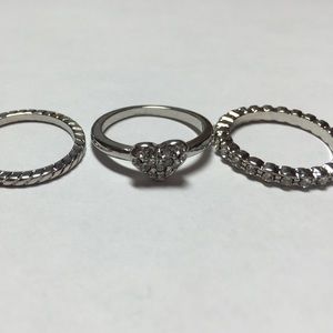 Silver colored rings. Never worn. Stackable. The main ring is the rhinestoned heart.
