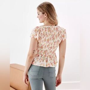 AE V-Neck Smocked Babydoll Blouse Floral Print Top Shirt Sleeve Sz S