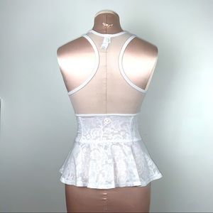 AE work out mesh top with floral design and peplum bottom.