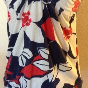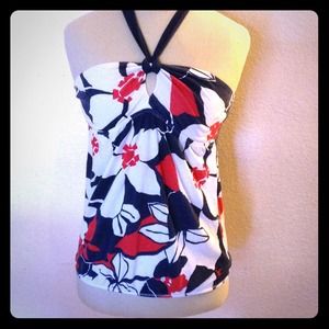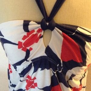 super cute halter top with a cross neck tie! perfect with shorts and sandals on a hot day! very comfortable and in great shape!